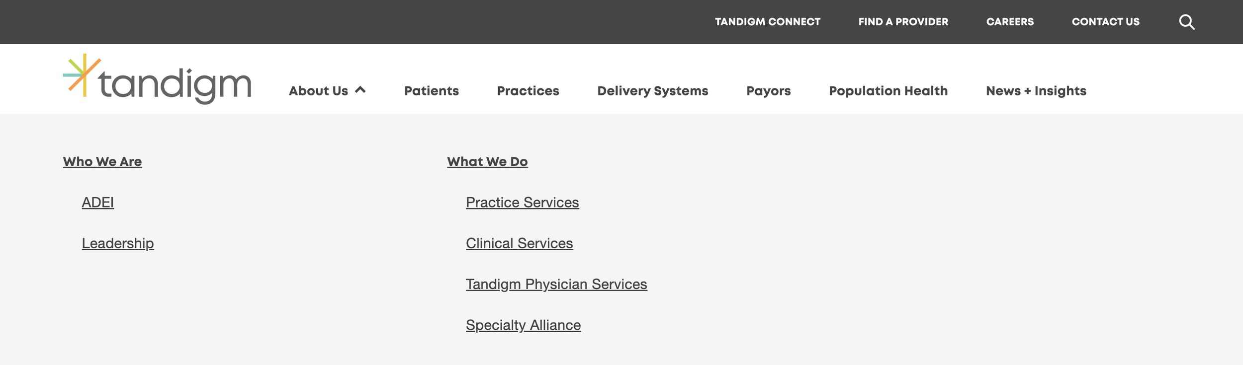 Working on the site refresh for Tandigm Health was an exercise in guiding the user experience from start to finish — from uncovering an inkling of an idea through surveys all the way to building fully-designed pages in the CMS. The project required a deep dive into the world of value-based care to create a site that can legitimize the company, position them as a leader in the market, and bring clarity to the value they bring.